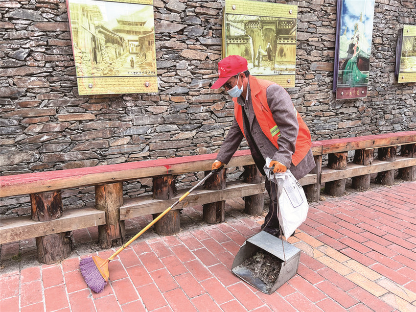 環(huán)衛(wèi)工人正在清掃阿里布果步游道。