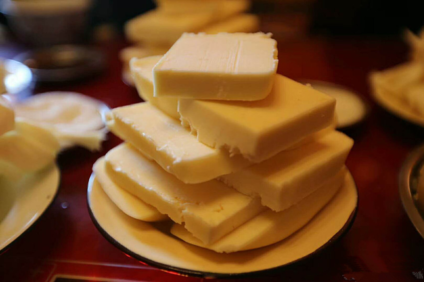 酥油是藏族民眾主要的食用油脂。藏族諺語說:“沒有駿馬的草原不美,沒有酥油的糌粑不香?!辈刈迕癖姶蛩钟筒?、揉糌粑都離不開酥油。據(jù)史料記載,文成公主入藏時,帶去了內(nèi)地的茶葉,公主“使乳變成奶酪,從乳取酥油”,有了茶和酥油,才有了酥油茶。