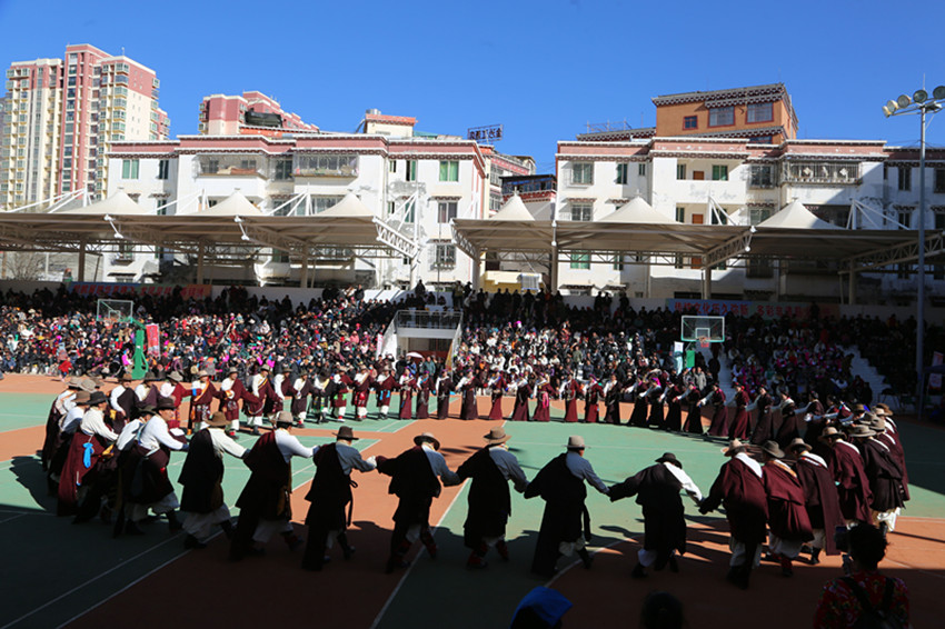 弦音聲動鬧新年,紅綾長袖舞春風(fēng),千人弦子鍋莊,唱出龍年大團(tuán)圓,踏出幸福新舞步……2月13日,在巴塘縣全民健身活動中心舉行的春節(jié)暨藏歷新年系列活動“文化·點(diǎn)靚生活”——巴塘縣五彩藏鄉(xiāng)藝術(shù)周弦子鍋莊展演活動現(xiàn)場喜氣洋洋、人頭攢動,上千名群眾身穿節(jié)日盛裝,拉起弦胡,載歌載舞,共同慶祝新春佳節(jié),祈盼龍年國泰民安、風(fēng)調(diào)雨順。圖為活動現(xiàn)場。 敖梅 李穎/文 格桑澤仁/圖