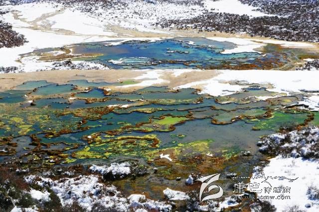 泉華灘位于貢嘎山西坡,為鈣化地貌,灘長900多米,寬100余米,依山而下形成5個泉華階地。每個階地上有數(shù)十個大小不同、形態(tài)各異的五色彩池,池中有羌活魚自在游弋。在泉華灘的頂上有一道趵突泉,不間斷地突然從地底噴發(fā),十分壯觀。