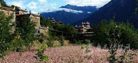 在青山腳下,綠樹(shù)環(huán)抱,小溪流徑之地,遠(yuǎn)遠(yuǎn)地便能看見(jiàn)屋檐下、窗戶(hù)的壁墻上勾畫(huà)著象征純潔白線(xiàn)的藏寨民居。一幢幢藏寨民居那么和諧地與大自然構(gòu)成一幅美麗的風(fēng)景。